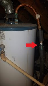 4. How to turn off the water to your water heater. The valve in this picture when shut off will turn the water flowing into your water heater off. However, if your water heater is leaking a the base of the water heater, all water inside the tank (40 – 50 gallons) will continue to drain until the tank is empty. If you find yourself in this situation and the pan is not draining you can hook up a water hose to the base of the water heater and run the hose to a bathtub or outside of your home.