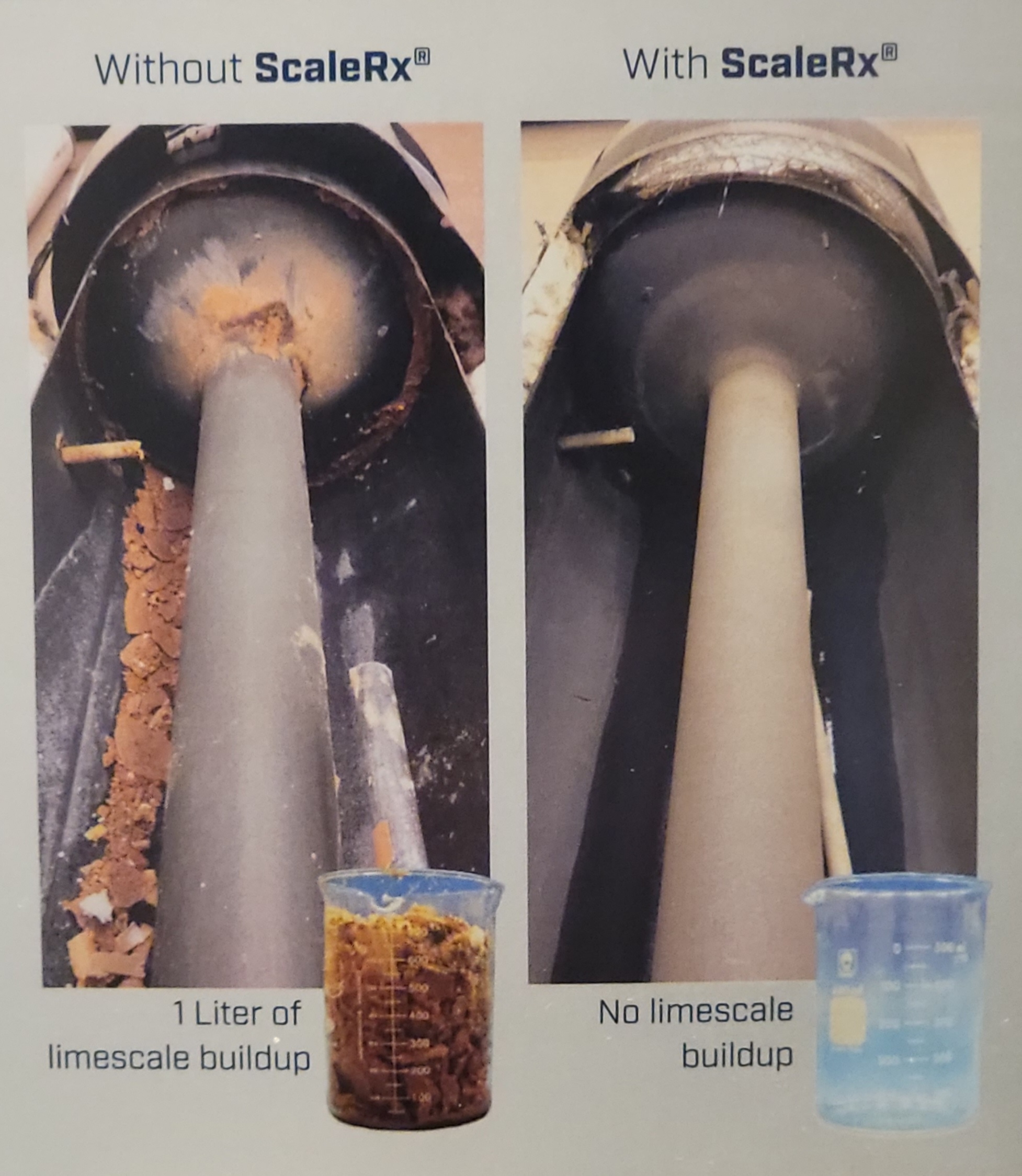 After 1 year, the heater without Scale RX produced nearly 1 liter of scale deposits, while the heater with ScaleRx produced zero scale deposits.